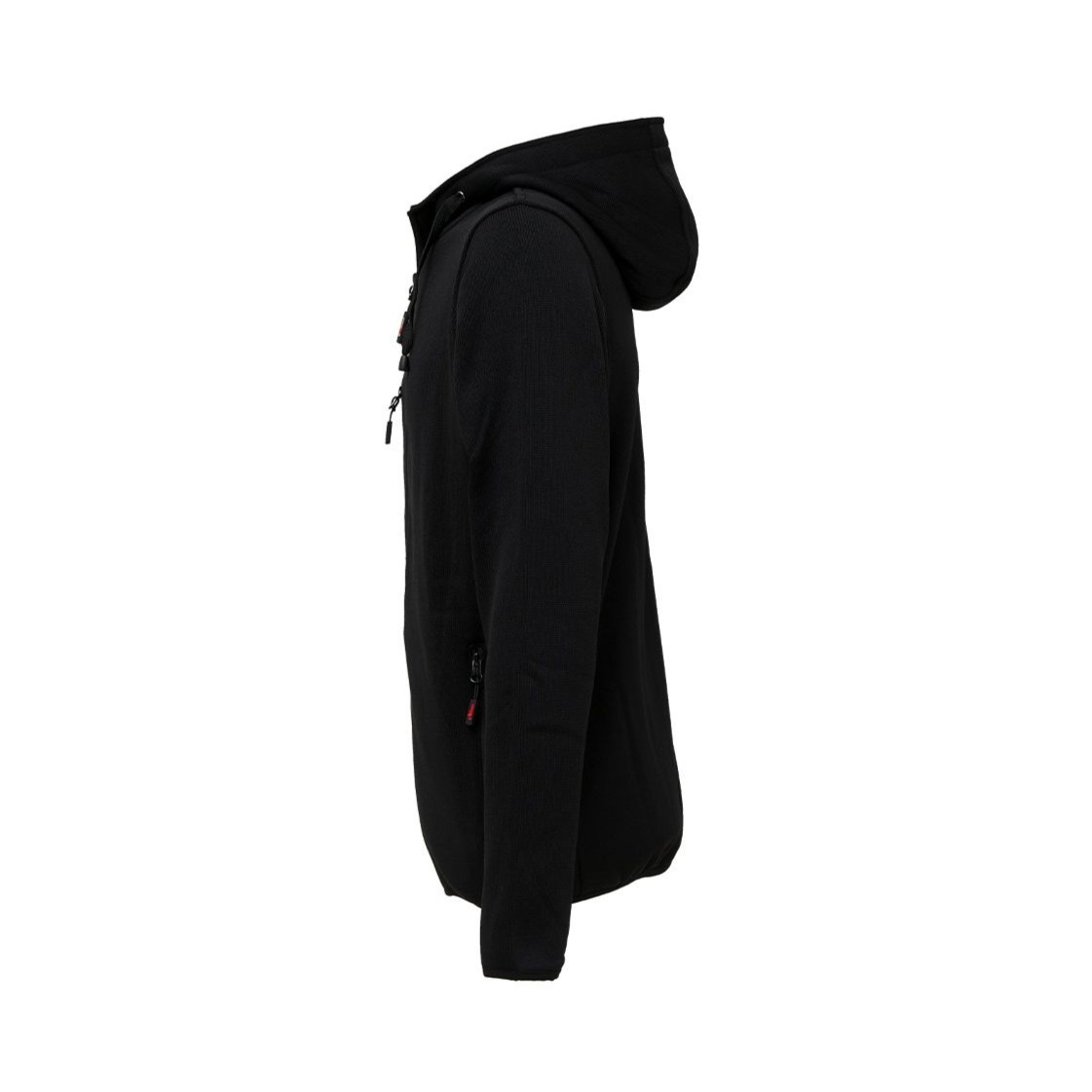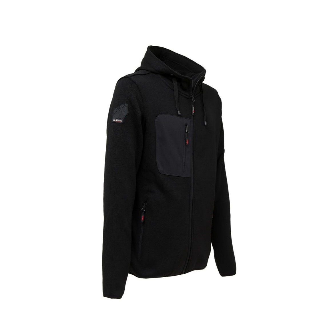 Felpa U-Power di colore nero con zip lunga ed interno in pile. Colletto alto e cappuccio regolabile. Polsi e fondo in tessuto elasticizzato. Due tasche frontali e una tasca posizionata al petto destro chiusa con zip. Logo UPower tono su tono applicato su braccio destro.