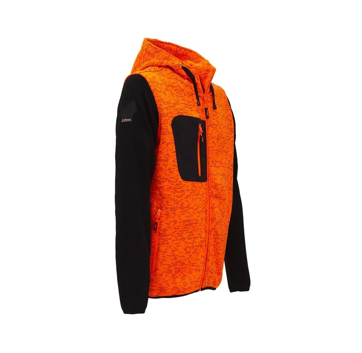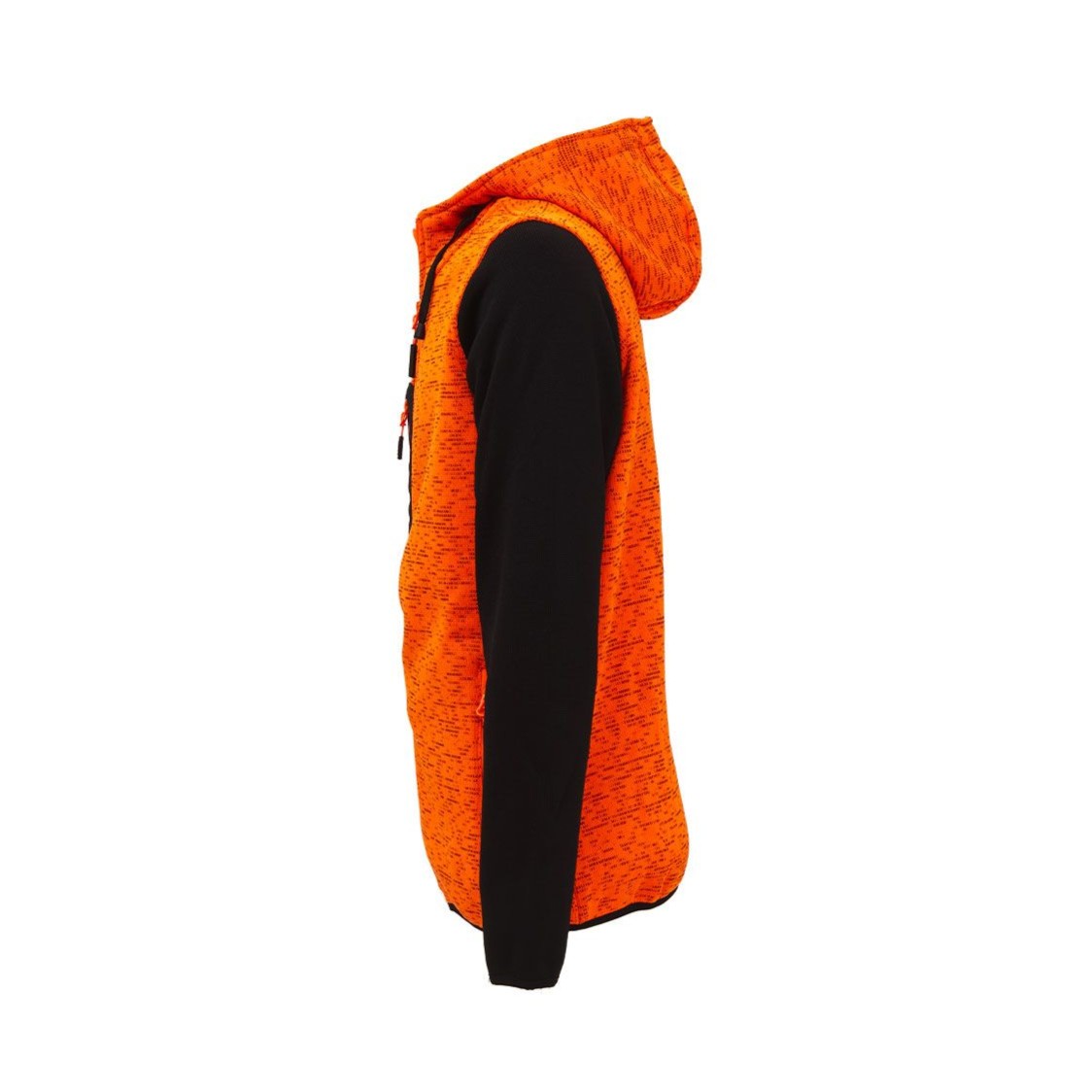 Felpa U-Power di colore arancio con zip lunga ed interno in pile. Colletto alto e cappuccio regolabile. Polsi e fondo in tessuto elasticizzato. Due tasche frontali e una tasca posizionata al petto destro chiusa con zip. Logo UPower tono su tono applicato su braccio destro.