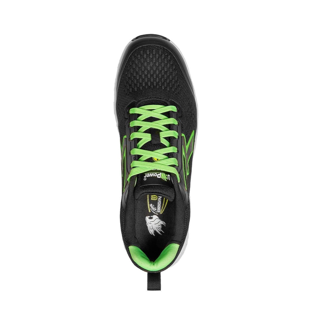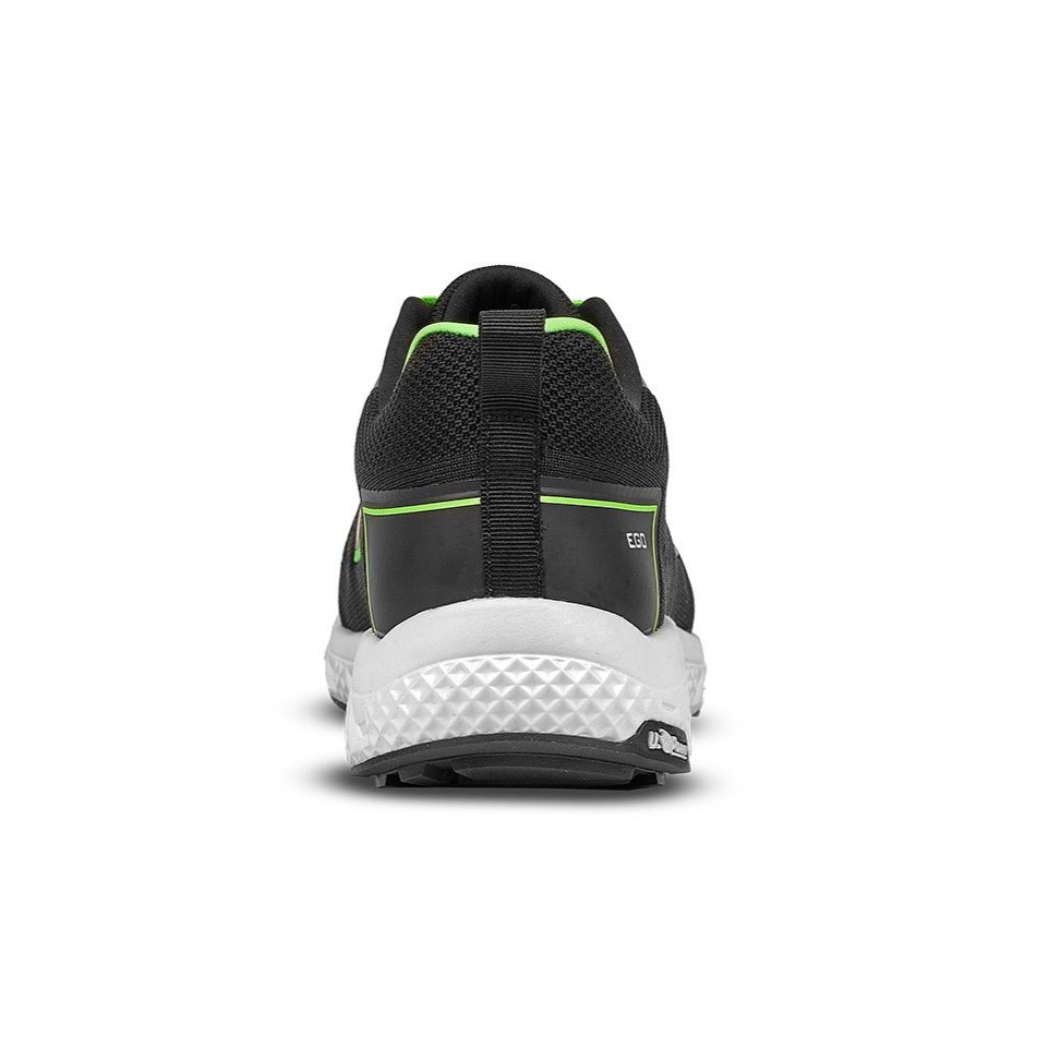 Calzatura antinfortunistica leggera, colore nero con dettagli verdi.